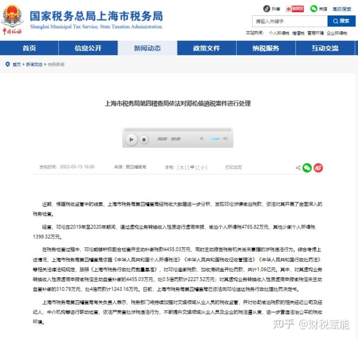 今日,上海市稅務(wù)局第四稽查局根據(jù)稅收監(jiān)管中的線索,經(jīng)稅收大數(shù)據(jù)進(jìn)一步分析,發(fā)現(xiàn)鄧倫涉嫌偷逃稅款。